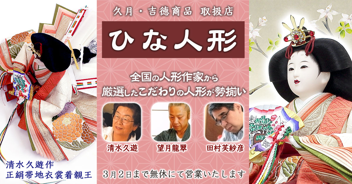 - 【ひな人形】の展示・販売は3月2日まで、無休にて営業いたします。ひな祭りに間に合うようにお届けいたしますので、お急ぎの場合でも是非ご相談下さい。