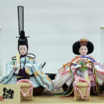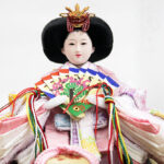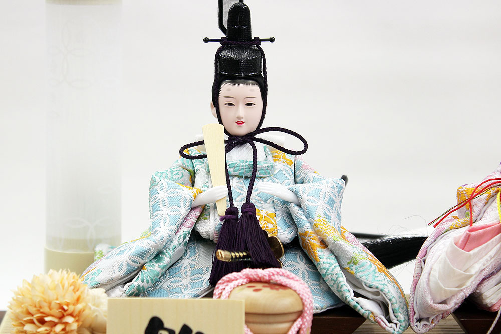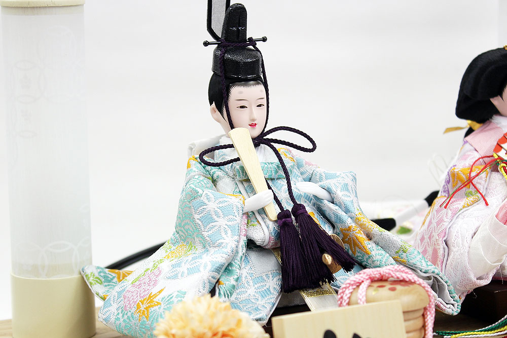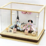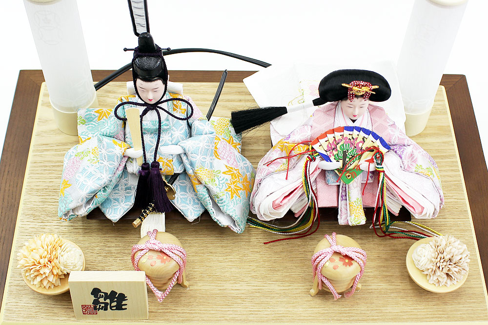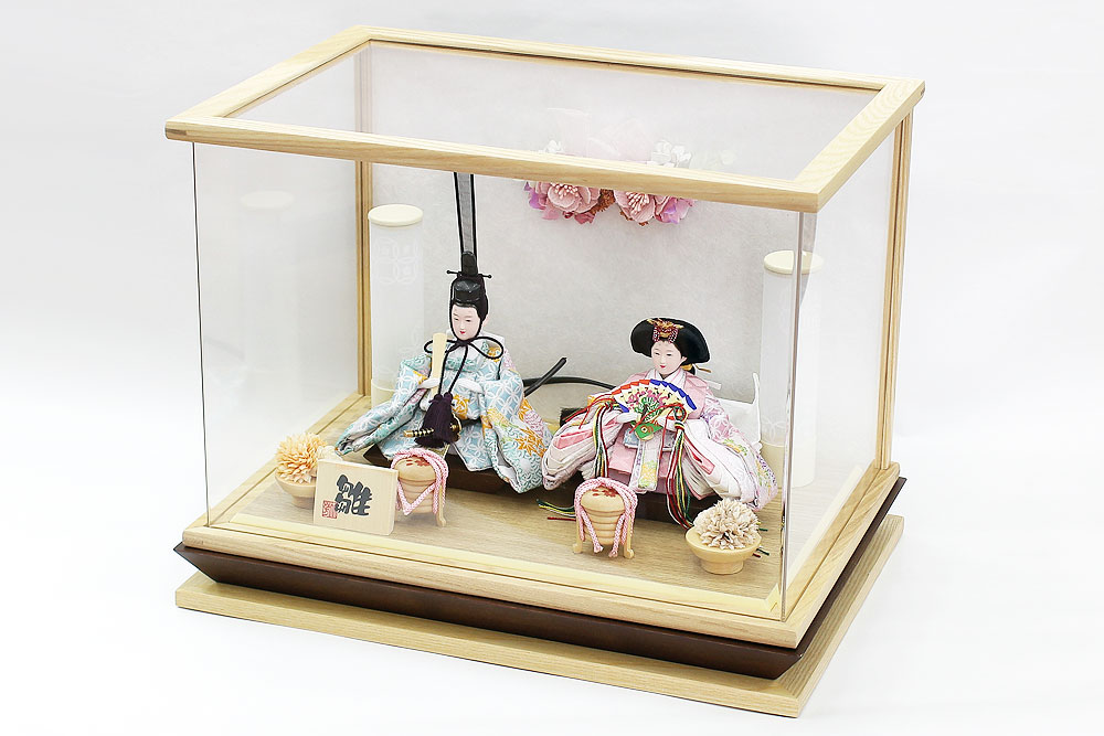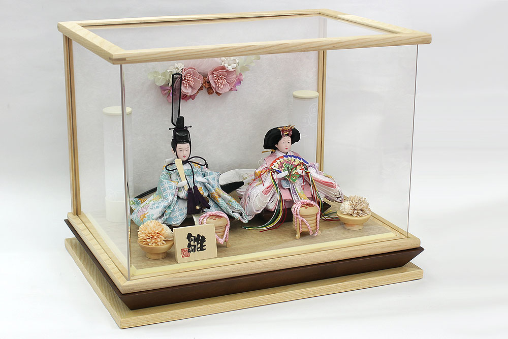 | 縁起の良い七宝柄地模様の明るい衣裳の親王のケース飾りです。ツートーン木目調のアクリルケースが格式高い雰囲気を感じさせます。