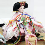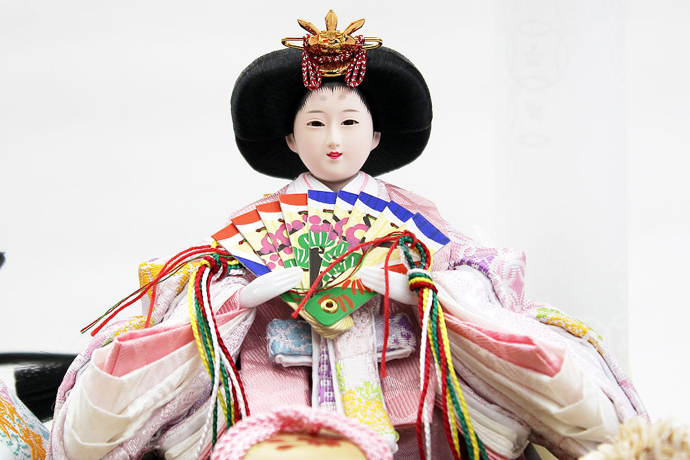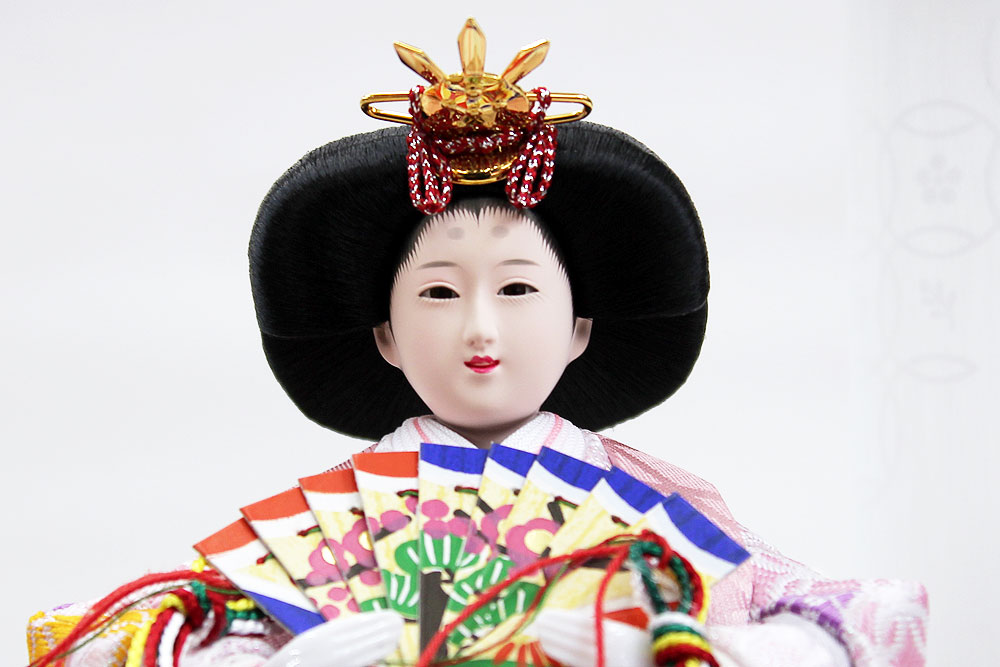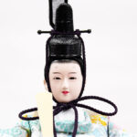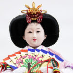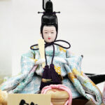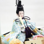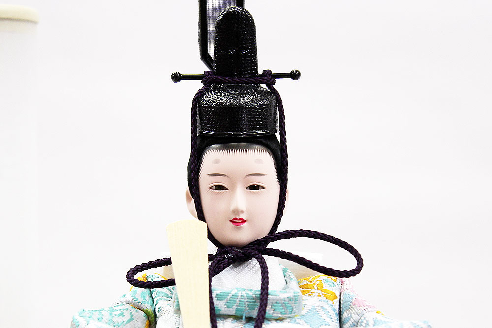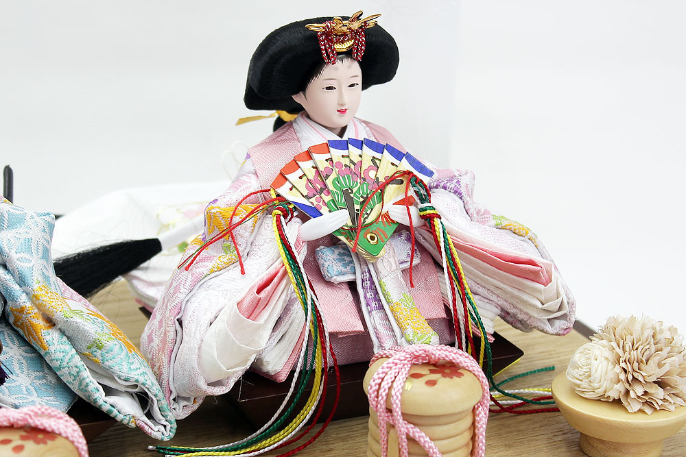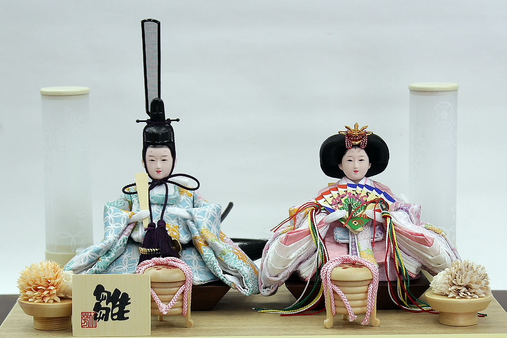 | 縁起の良い七宝柄地模様の明るい衣裳の親王のケース飾りです。ツートーン木目調のアクリルケースが格式高い雰囲気を感じさせます。