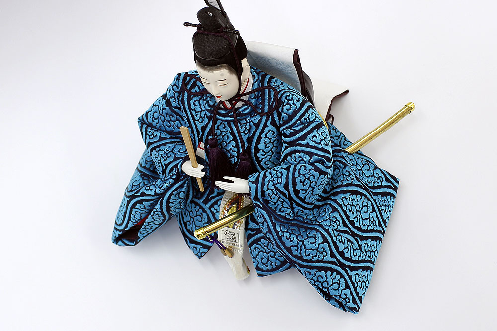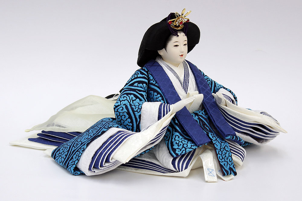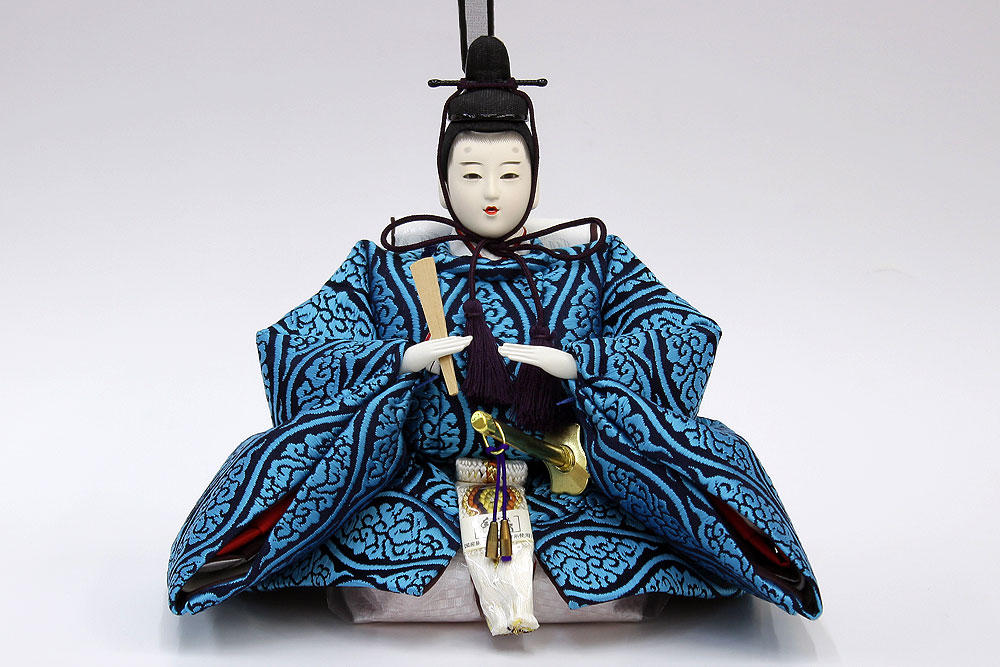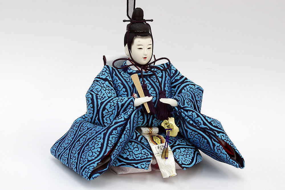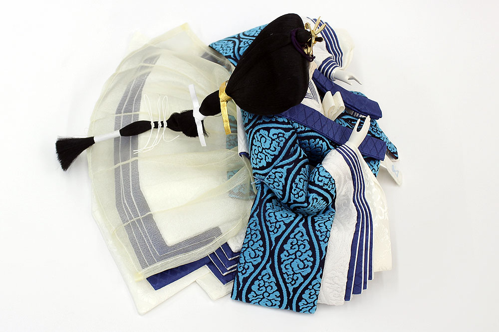 | 鮮やかな藍色が目を引く雲立涌文様の正絹衣裳をまとった親王のお値打ちセットです。