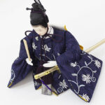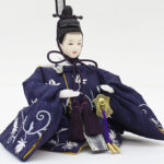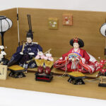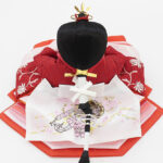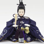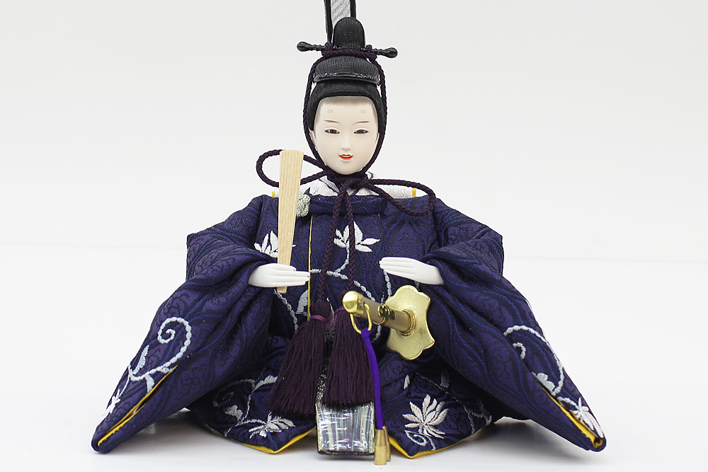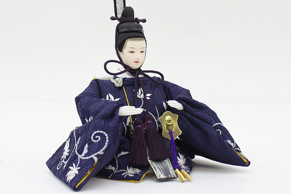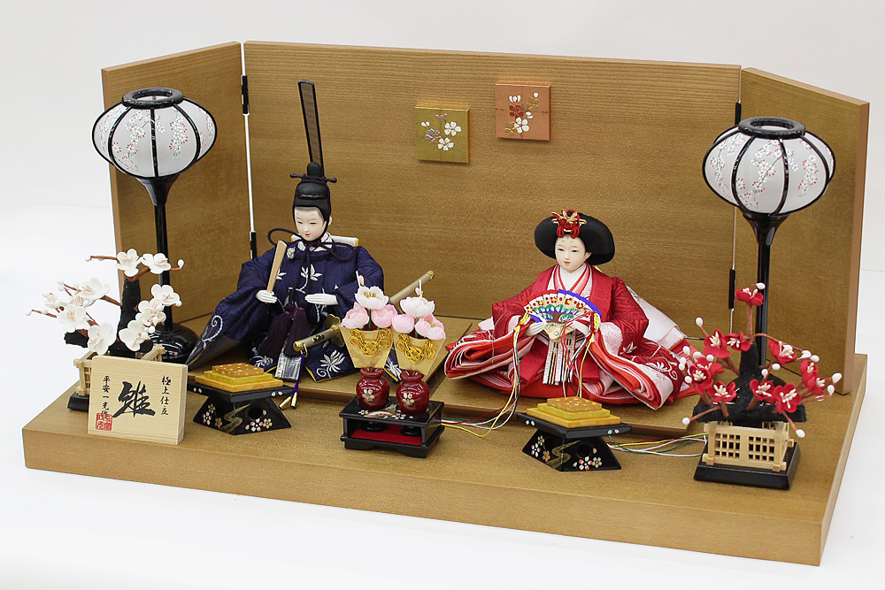 | 縁起の良い立涌文様を地模様に配した蔓草文様の衣裳をまとった親王と、中央部にレリーフが配された木目調屏風・台のセットです。