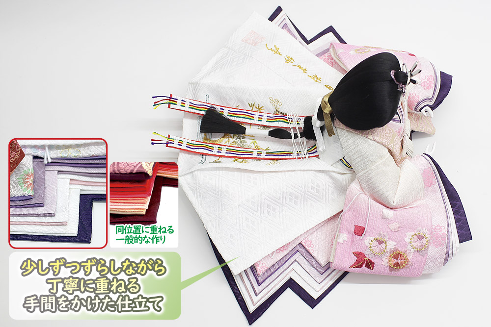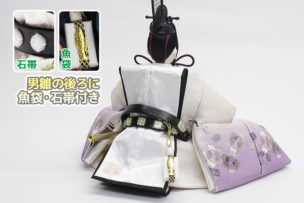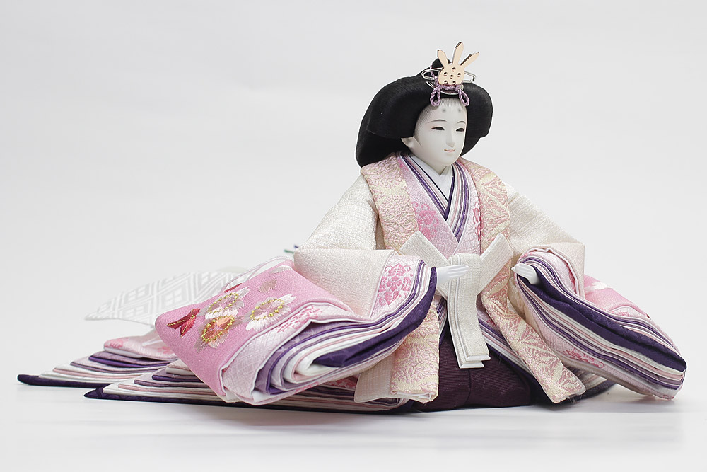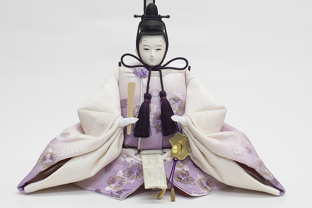 | 白色を基調としたグラデーション調の刺しゅう衣裳をまとった親王と、金彩流水桜柄の白木調屏風の気品あふれる雰囲気のセットです。【人形師:田村芙紗彦】【頭師:熊倉基安】