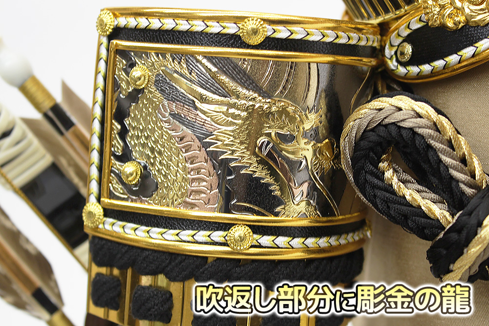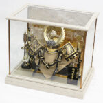 シダの葉の前立が特徴的な徳川家康公の甲冑を模した兜ケース飾りです。吹返し部分に彫金の龍を配した兜を白木調のケースに合わせた上品な雰囲気のお飾りです。