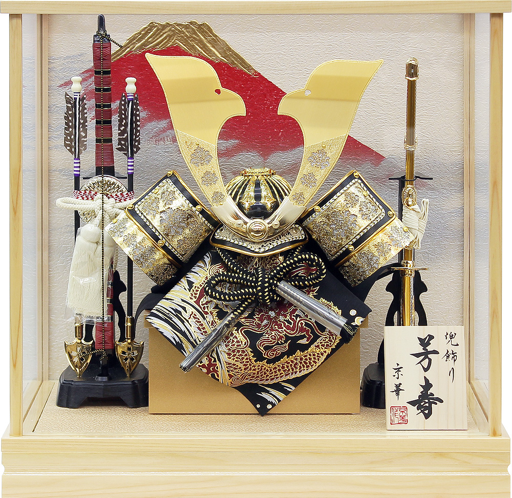 | 兜両脇の吹き返し部分と鍬形部分に透かし金具が配された華やかな雰囲気の兜ケース飾りです。背景に金彩赤富士が描かれた白木調ケースのお飾りです。