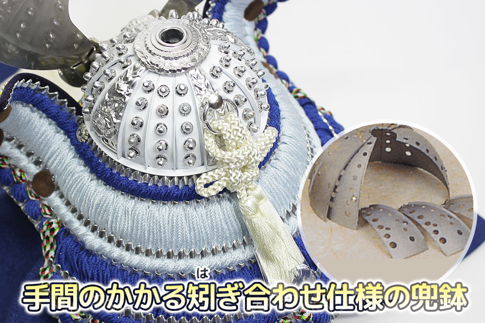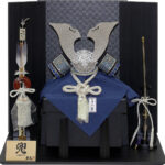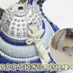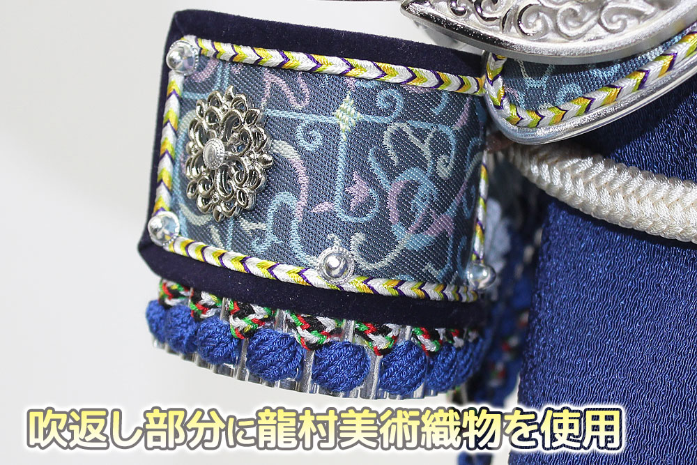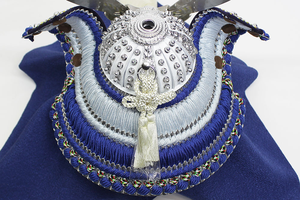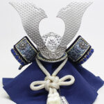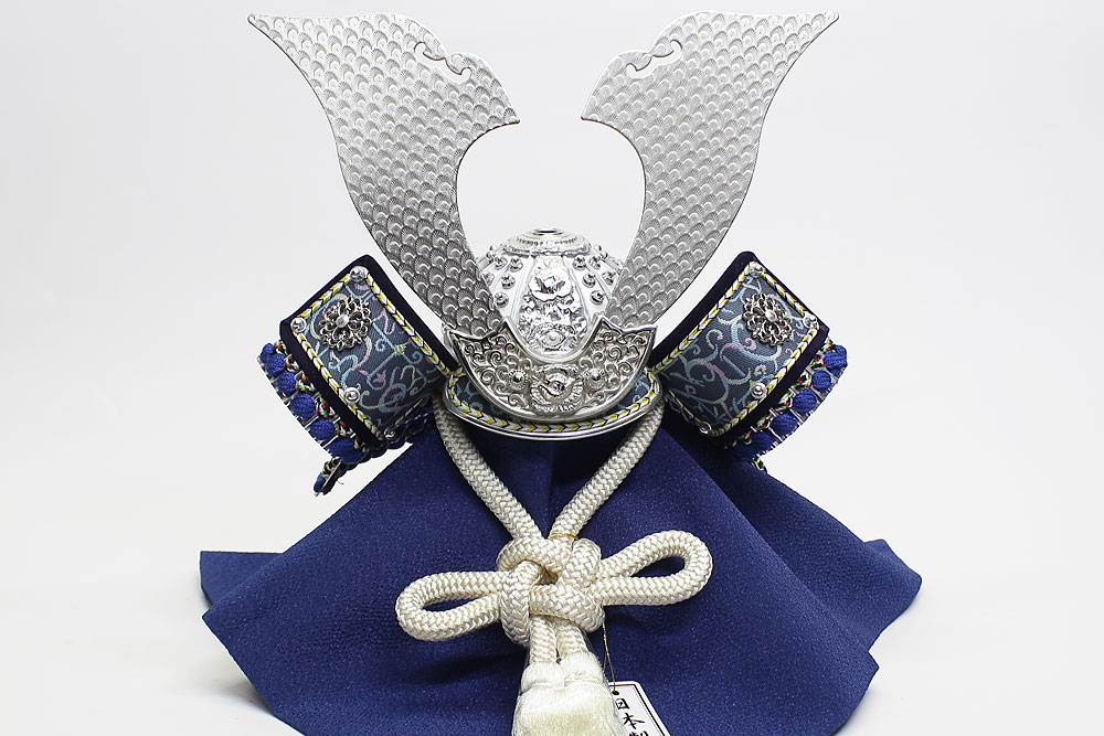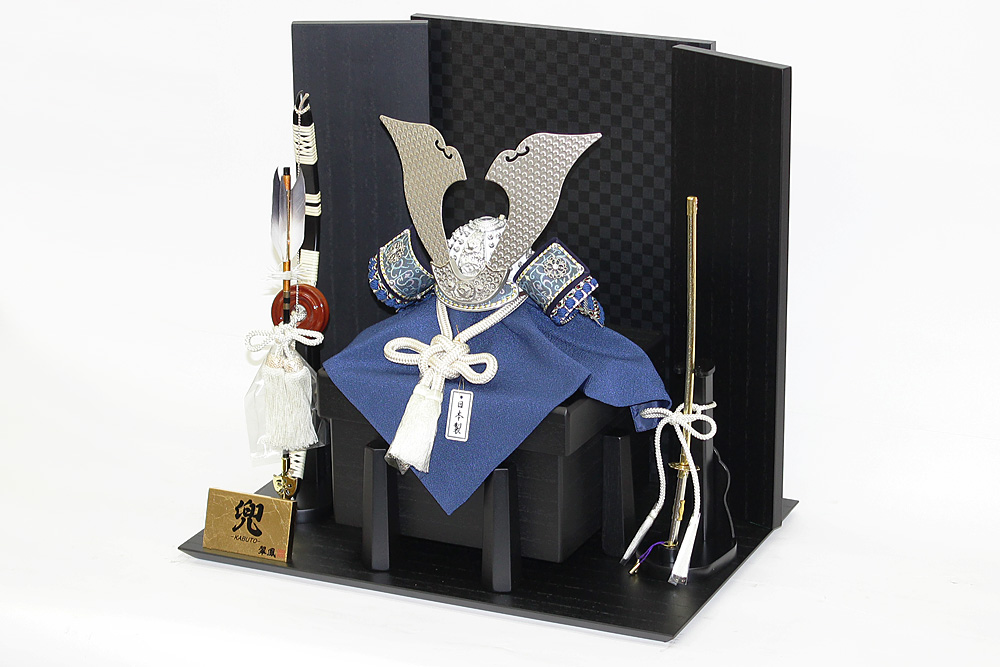 | 米国へ送られた「金の兜」を製作した話題の甲冑師・平安翠鳳が手掛ける、吹返し部分に龍村美術織物を使用した兜飾り。青色を基調としたシルバー調の凛とした雰囲気の逸品です。頭の鉢部分は手間のかかる矧ぎ合わせ鉢仕様の高級仕立て。黒市松模様柄の屏風・台とのセットです。