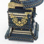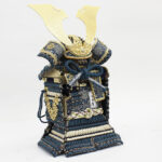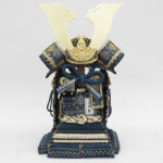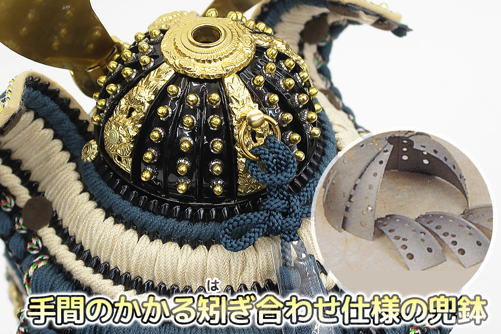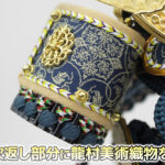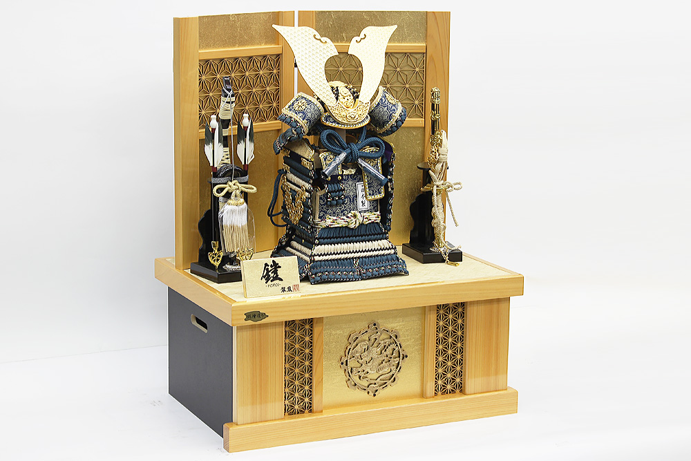 | 甲冑師・平安翠鳳が手掛ける奉納スタイルの鎧飾り。吹き返し部分や胴部分に龍村美術織物を使用し、兜の鉢部分が合わせ鉢仕様になった高級仕立ての鎧飾りです。魔除けの意味合いをもつ麻の葉文様をあしらった、総檜造りの高級収納箱とのセットです。
