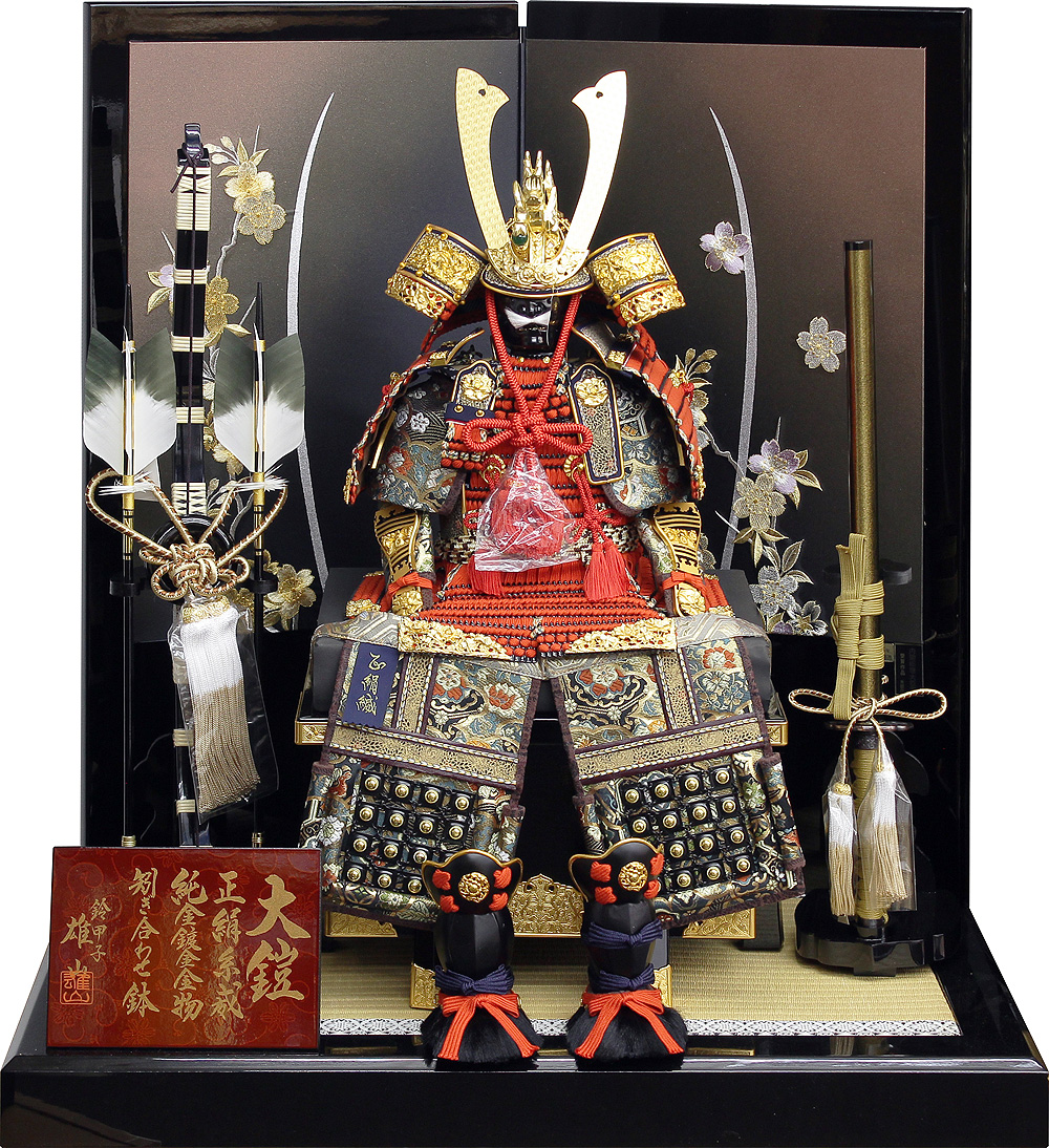 | 甲冑師・鈴甲子雄山作、漆塗りの小札を朱赤色の正絹糸で威した鎧飾りです。兜の鉢部分も手間をかけた覆輪仕立ての矧ぎ合わせ仕様。刺繍枝桜柄の高級屏風とのセットです。