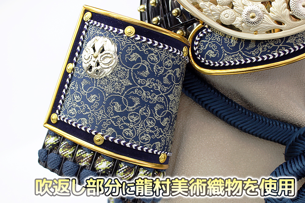 | 【着用兜は2歳~4歳用】吹き返し部分に龍村美術織物を使用した着用兜の収納飾り。頭部の鉢部分が合わせ鉢仕様になっており、手間のかかった仕立てになっています。細やかな木工細工が施されたおしゃれな白木調の屏風・収納箱とのセットです。