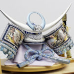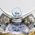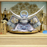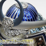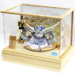 | 吹返し部分に彫金龍を配した上杉謙信公の甲冑を模した兜ケース飾りです。シルバーとブルーを基調にしたモダンな雰囲気の兜が木目調枠のケースによく馴染みます。※アクリルケース