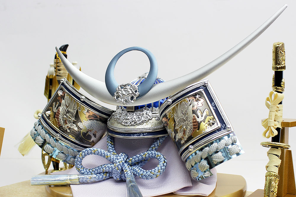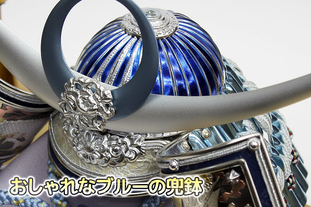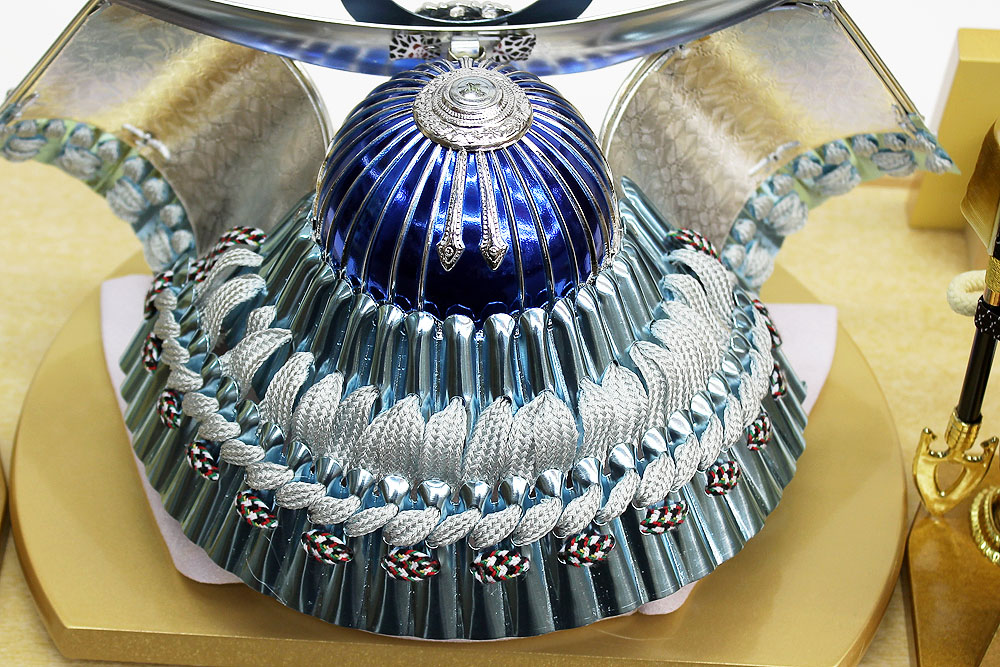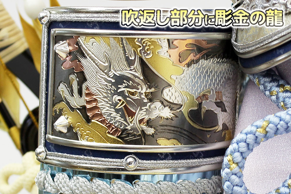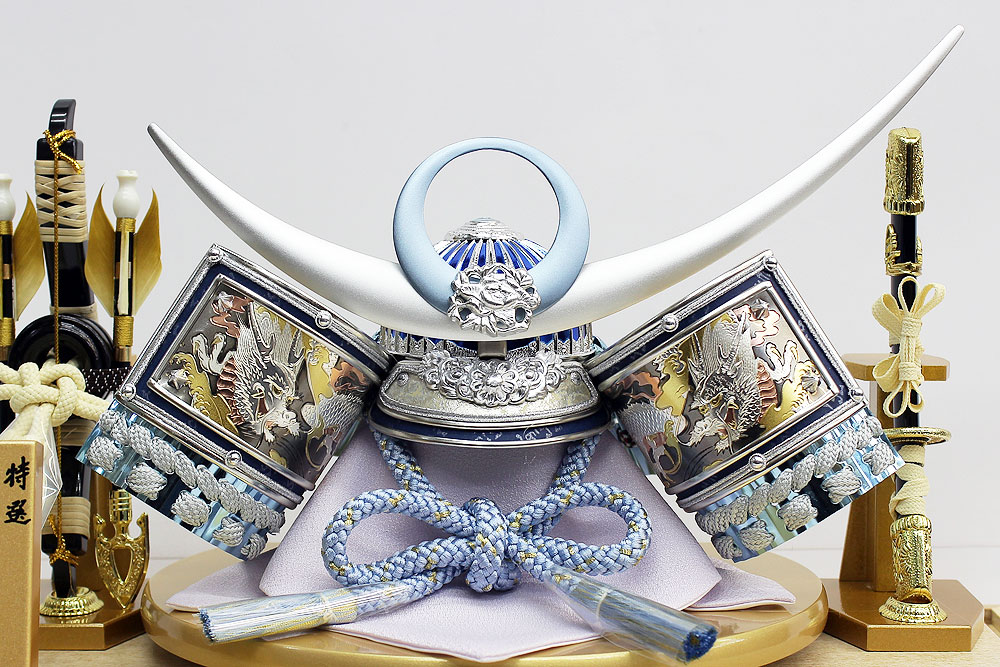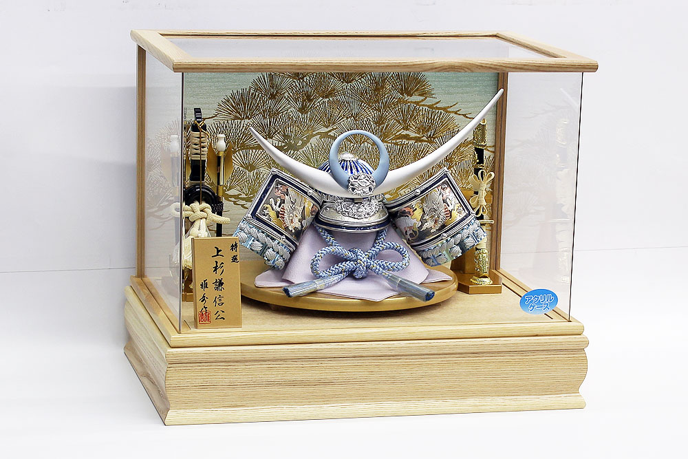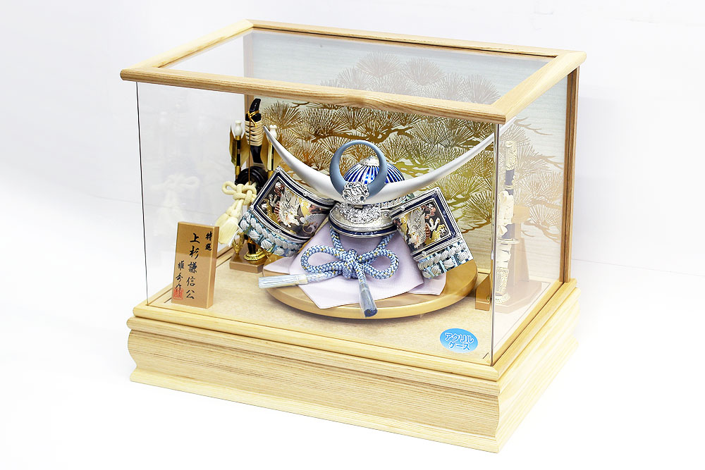 | 吹返し部分に彫金龍を配した上杉謙信公の甲冑を模した兜ケース飾りです。シルバーとブルーを基調にしたモダンな雰囲気の兜が木目調枠のケースによく馴染みます。※アクリルケース