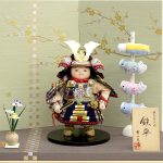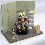 | 雛人形の木目込作家としても有名な幸一光作、勇ましいお顔の鎧着大将飾りです。紺糸の沢瀉威しの鎧が高級感を感じさせます。絹しけ調の金彩梅柄屏風とのセットです。