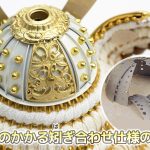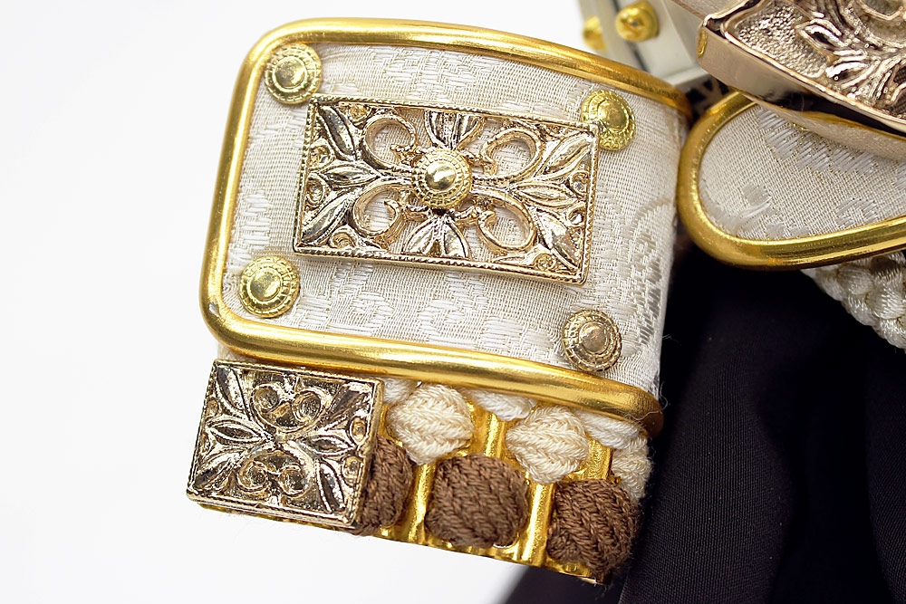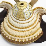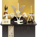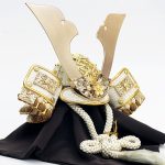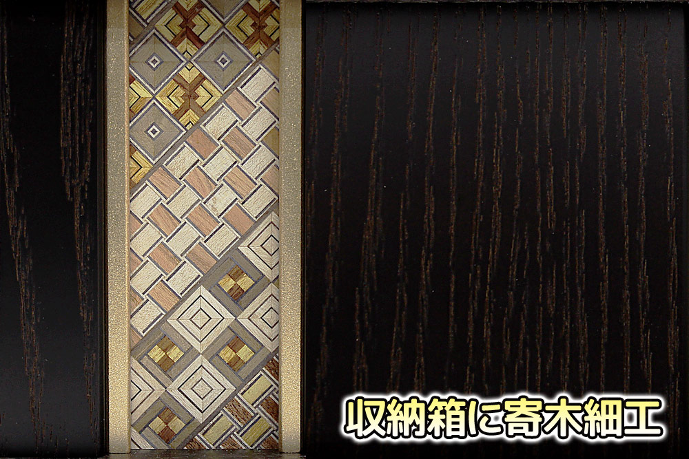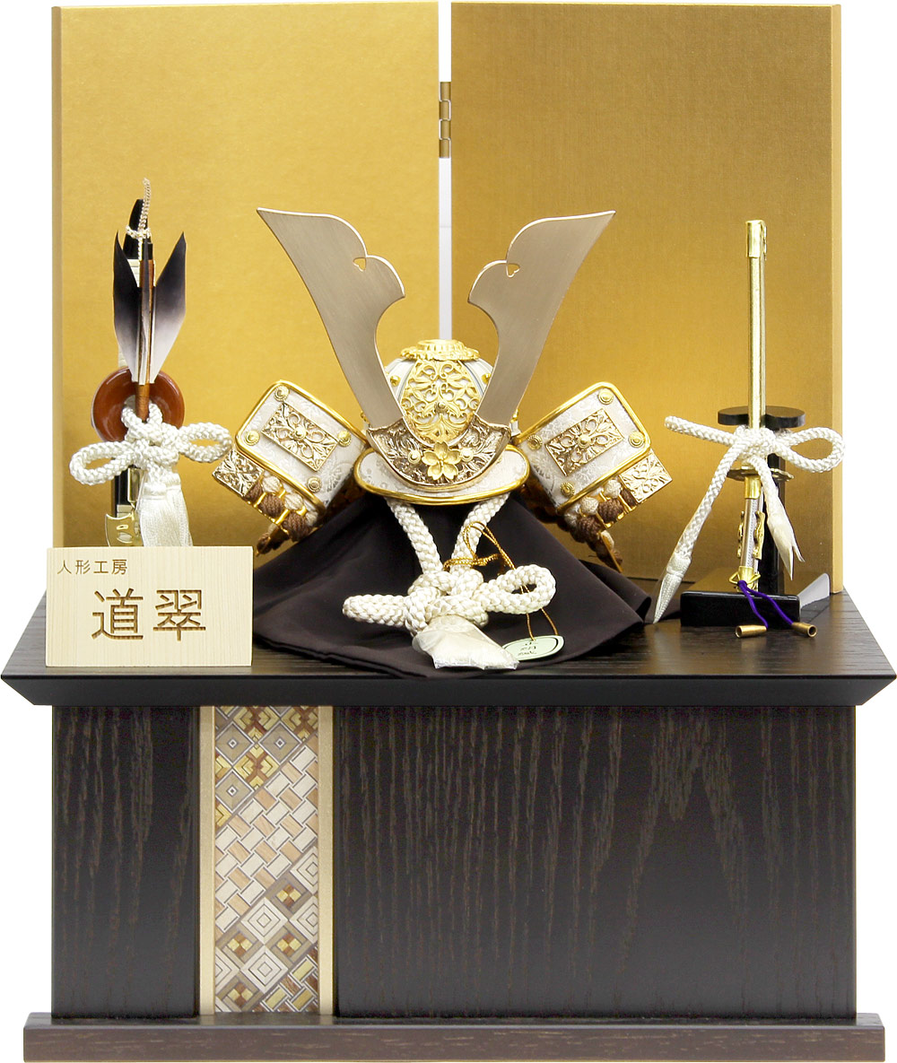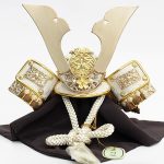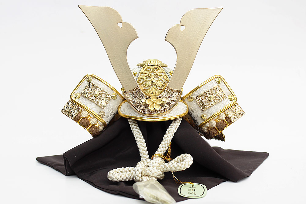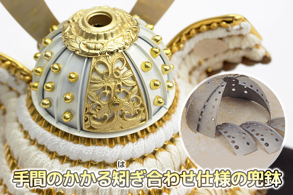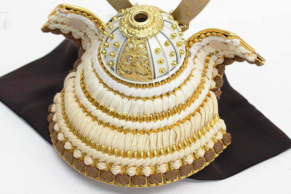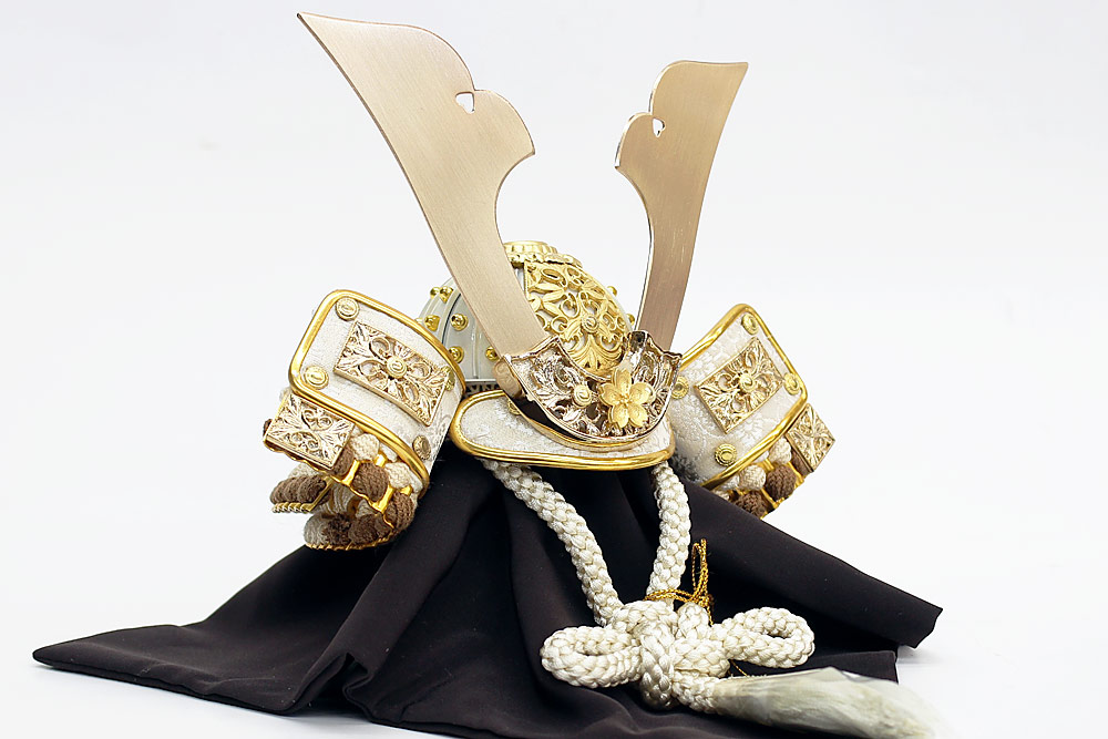 白を基調とした上品な雰囲気を醸し出す兜のコンパクトな収納飾りです。頭部分の鉢が合わせ鉢仕様になった高級仕立て。収納箱には寄木細工が配された逸品セットです。