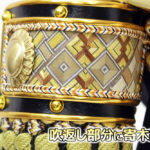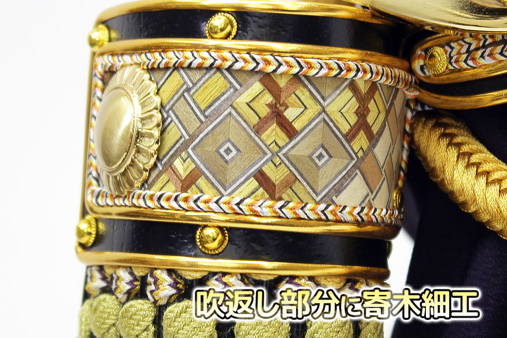 | 吹返しに寄木細工が配され、手間のかかる矧ぎ合わせ鉢仕様の造りの良い大鍬形兜の収納飾りです。同じく寄木細工が各所に配された桧造りの高級収納箱とのセットです。