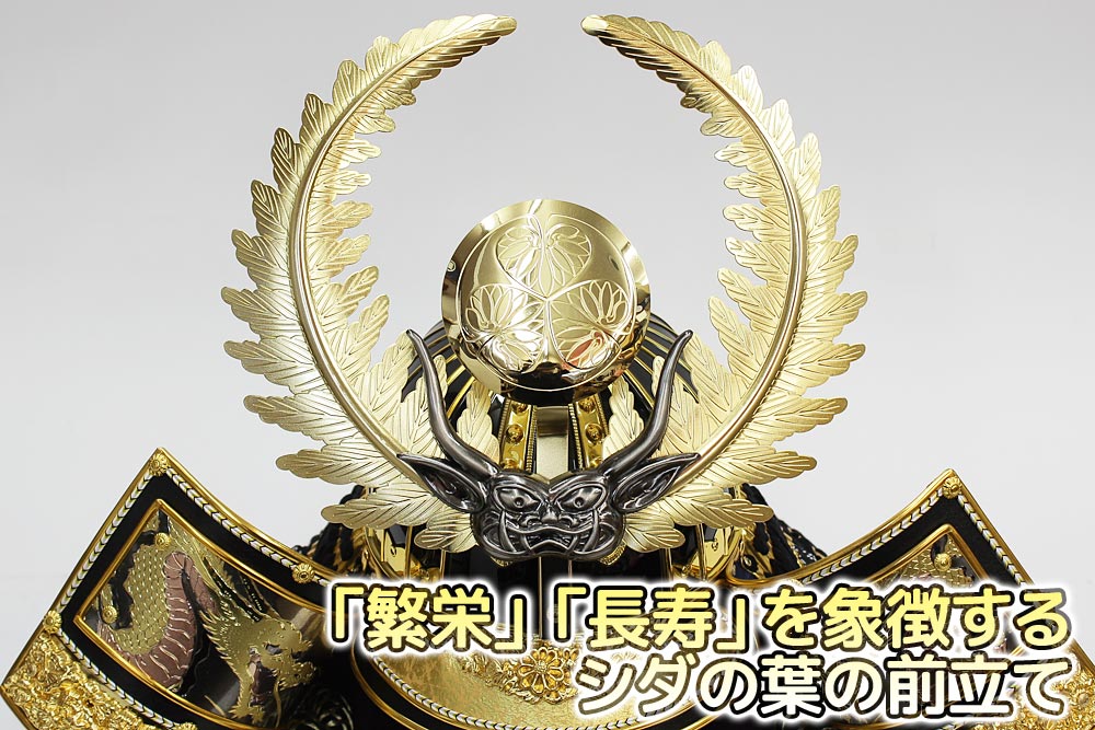 | 【着用兜は2歳~4歳用】子孫繁栄や長寿を象徴するシダの葉の前立が特徴的な、徳川家康公の甲冑を模した着用兜収納飾りです。グリーンぼかしの会津塗収納箱とのセットです。
