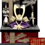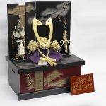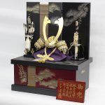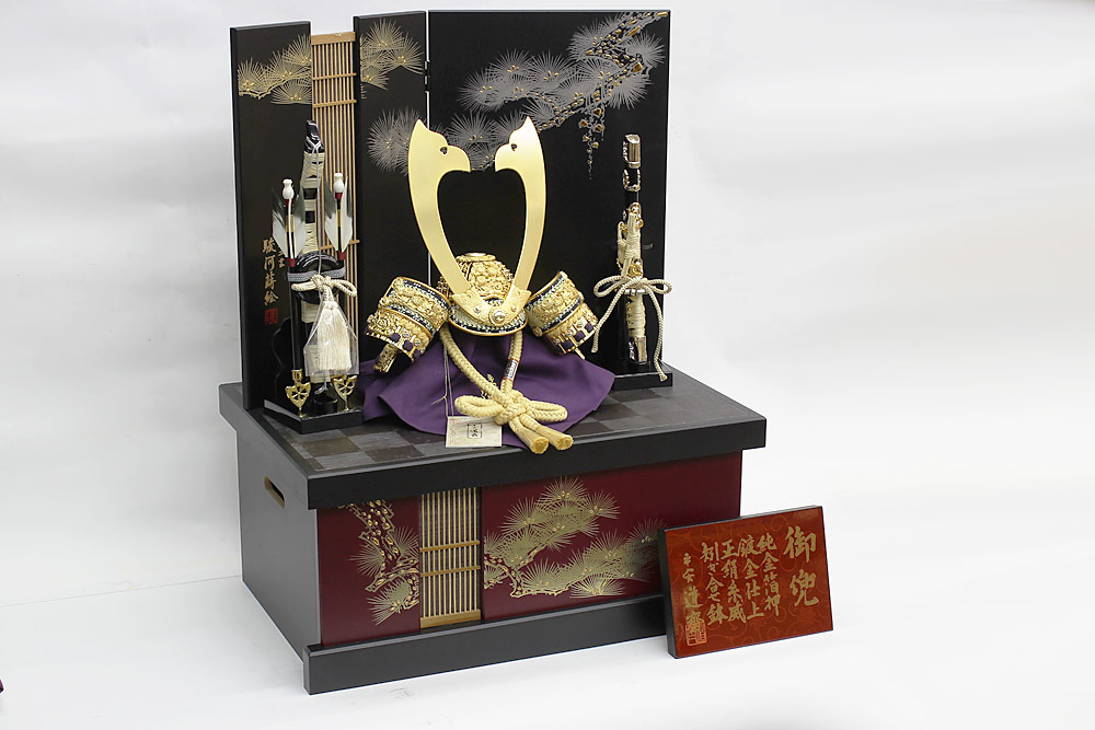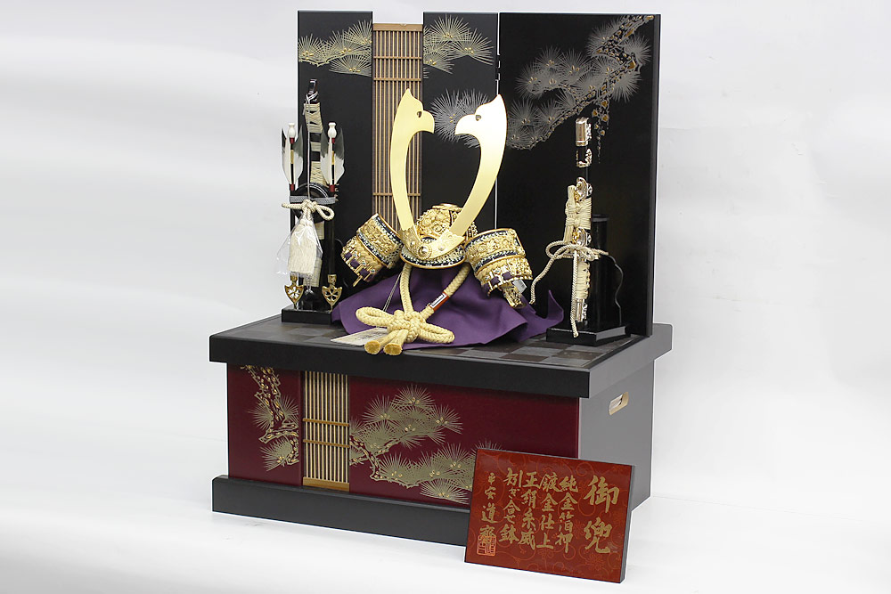 関東随一の甲冑師・平安道斎が作り出す緋糸威の兜飾り。兜を構成する小札(こざね)は金沢純金箔を一枚ずつ押していく純金箔押、裏にも透き漆を塗った「総裏」と称される厚金の最高級仕様です。兜の鉢部分も覆輪矧ぎ合わせ仕様の最高級仕立ての逸品兜飾りです。モダンなデザインの金彩松収納箱とのセットです。