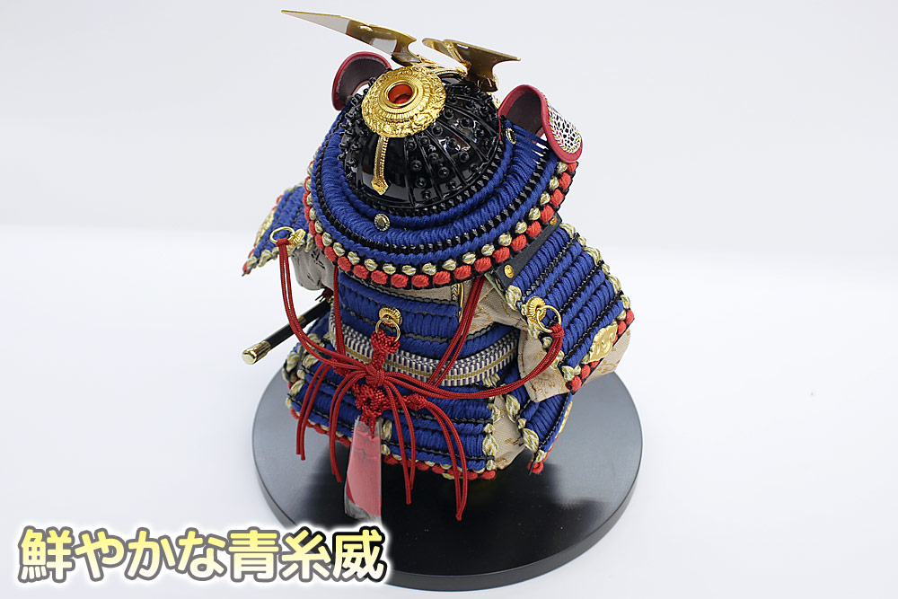 | 雛人形の木目込作家としても有名な幸一光作、優しいお顔の鎧着大将飾り。鎧は青色糸威しの鮮やかな色合いです。駿河竹筋細工の木目調高級屏風・台とのコンパクトなセットです。