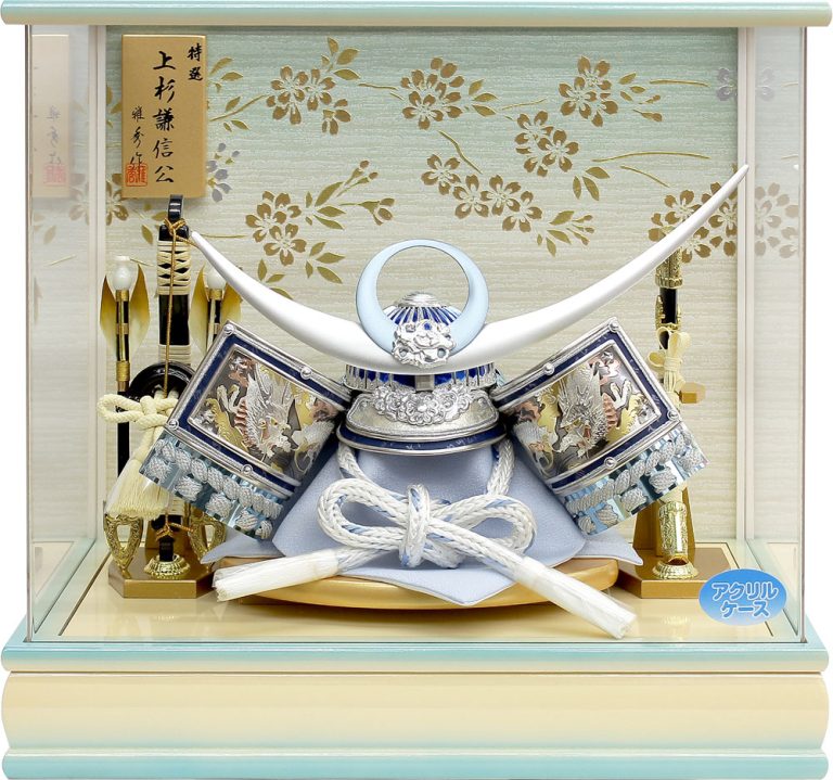 吹返し部分に彫金龍を配した上杉謙信公の甲冑を模した兜ケース飾りです。シルバーとブルーを基調にしたモダンな雰囲気の兜が木目調枠のケースによく馴染みます。※アクリルケース