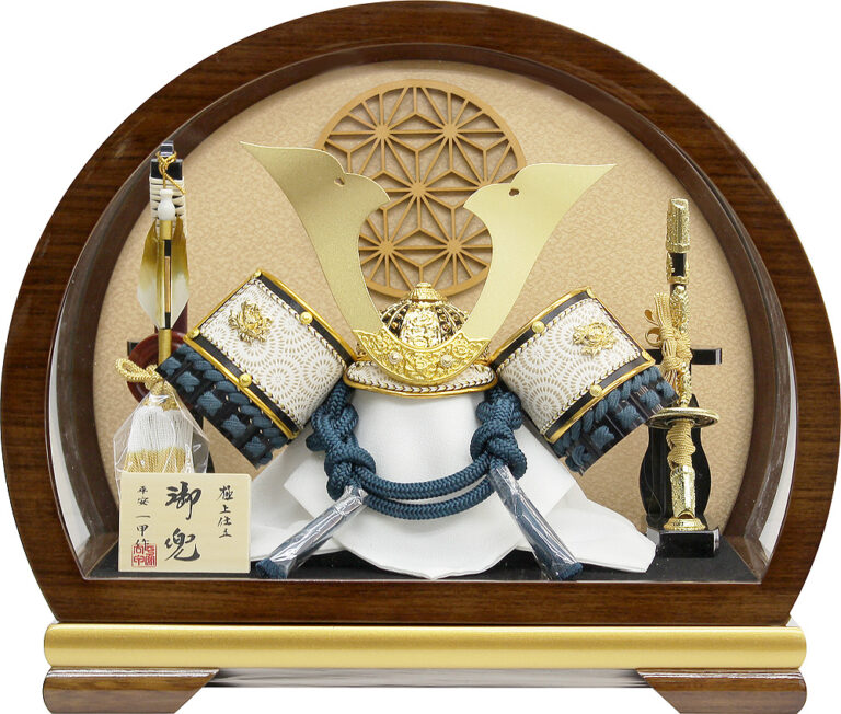 白を基調にした高級感のある兜のケース飾りです。木目調枠の半円形ケースがおしゃれなお値打ちセットです。※アクリルケース