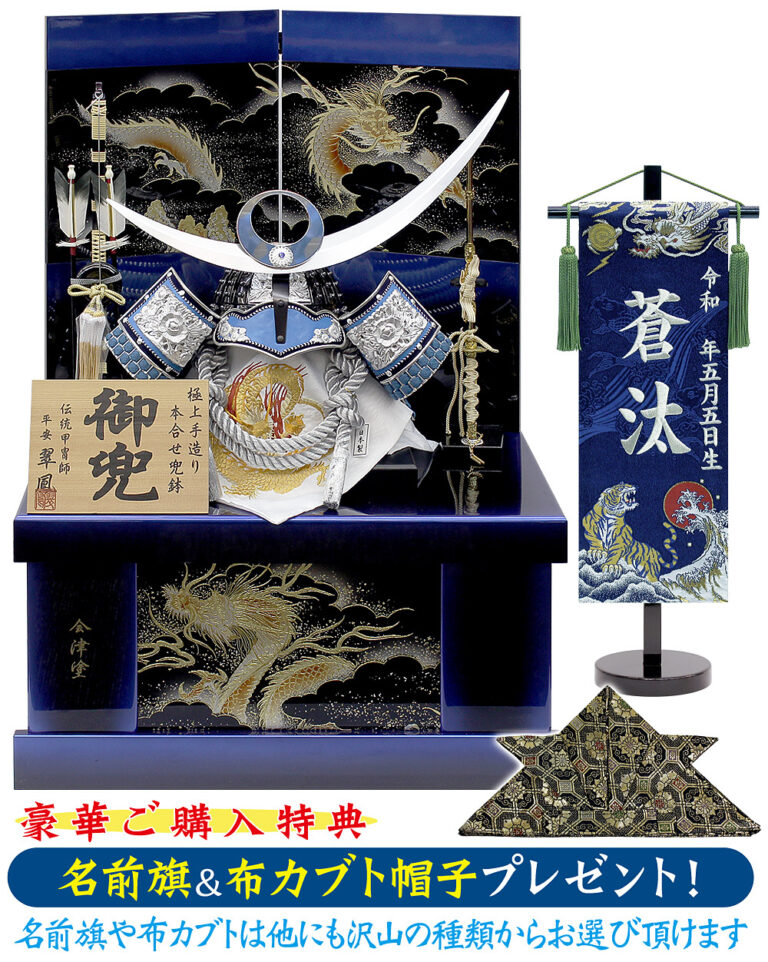[商品番号]26222 平安翠鳳作 25号上杉謙信着用兜飾り(収納式) 間口60×奥行43×高さ85cm 特別ご提供価格 191,950円(税込) お支払い方法によって「特別ご提供価格」より更にお安くお求め頂けます。各商品は数に限りがございますので、お早めのご検討をおすすめいたします。 【着用兜は2歳~4歳用】日輪に三日月型の前立が特徴的な上杉謙信公の甲冑を模した着用兜の収納飾り。ブルーとシルバーを基調とした兜が気品を感じさせます。頭部の鉢部分が合わせ鉢仕様になっており、手間のかかった逸品となっています。兜の色調に合わせたブルーぼかしの高級会津塗収納箱・屏風とのセットです。 この商品を詳しく見る