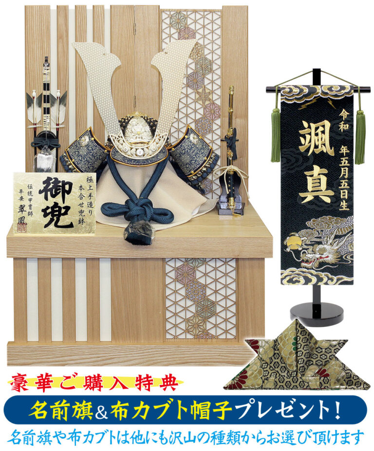 [商品番号]26223 平安翠鳳作 25号着用兜飾り(収納式) 間口60×奥行45×高さ83cm 特別ご提供価格 217,690円(税込) お支払い方法によって「特別ご提供価格」より更にお安くお求め頂けます。各商品は数に限りがございますので、お早めのご検討をおすすめいたします。 【着用兜は2歳~4歳用】吹き返し部分に龍村美術織物を使用した着用兜の収納飾り。頭部の鉢部分が合わせ鉢仕様になっており、手間のかかった仕立てになっています。細やかな木工細工が施されたおしゃれな白木調の屏風・収納箱とのセットです。 この商品を詳しく見る