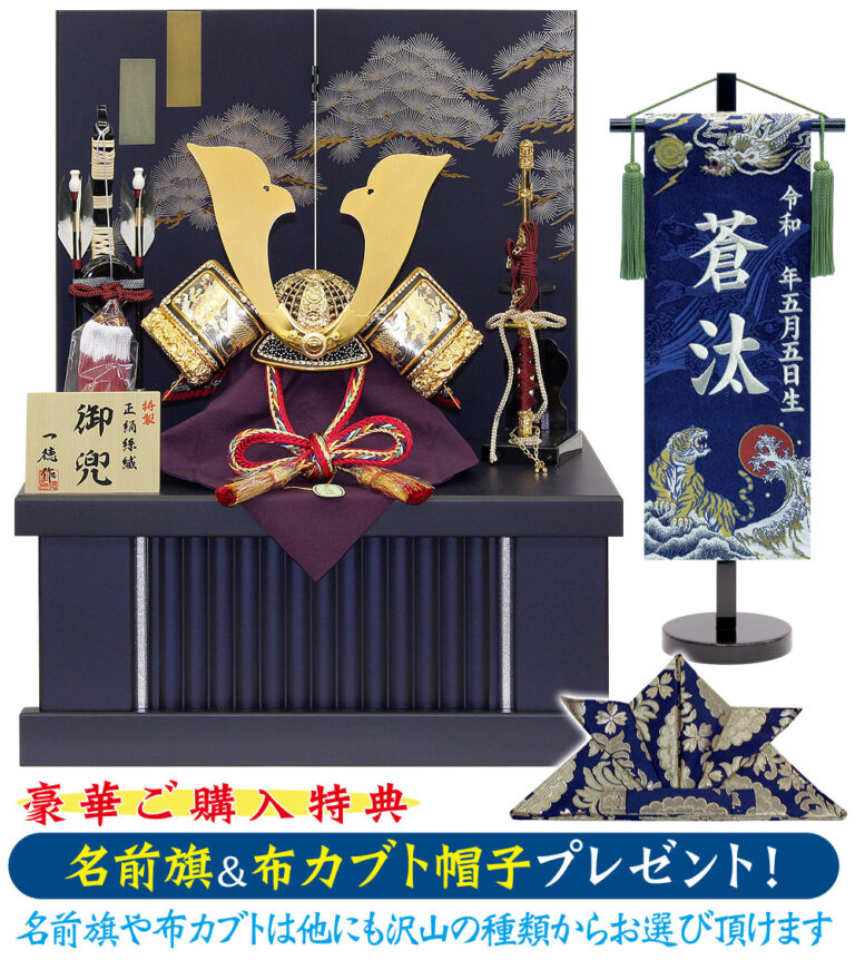 [商品番号]26132 一徳作 12号彫金兜飾り(収納式) 間口45×奥行30.5×高さ65cm 特別ご提供価格 105,160円(税込) お支払い方法によって「特別ご提供価格」より更にお安くお求め頂けます。各商品は数に限りがございますので、お早めのご検討をおすすめいたします。 吹返しに彫金龍が配され、大きな鍬形が力強さを感じさせる兜の収納飾りです。金彩松柄のおしゃれなデザインの収納箱とのお買い得セットです。 この商品を詳しく見る