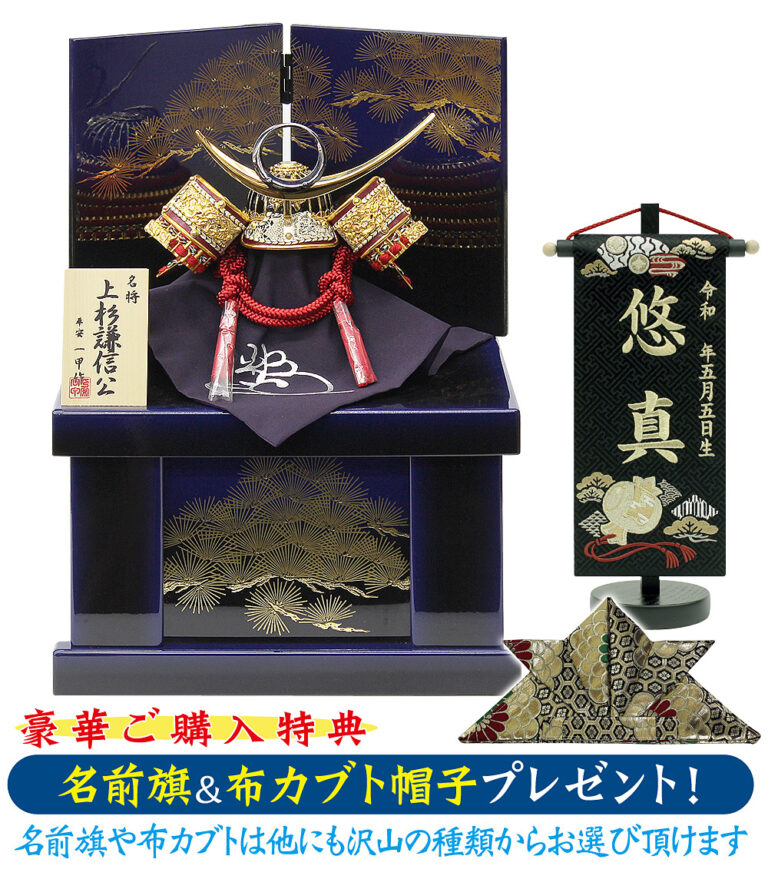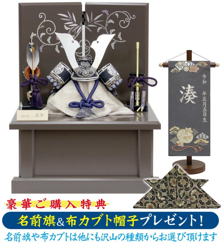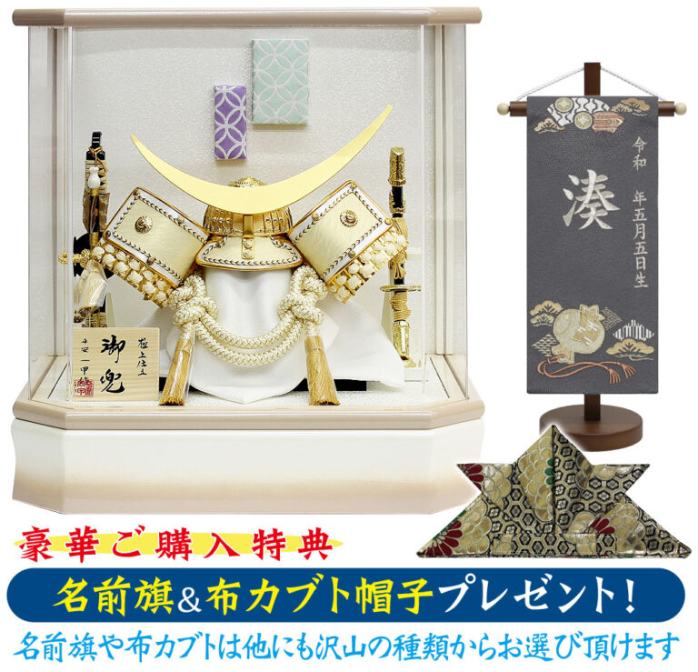 吹返し部分に革を使用し、アンティーク調の雰囲気を醸し出す兜のコンパクトなケース飾りです。ケース背景は男の子の健やかな成長を願う菖蒲や「勝ち虫」トンボなど、縁起の良い絵柄となっています。