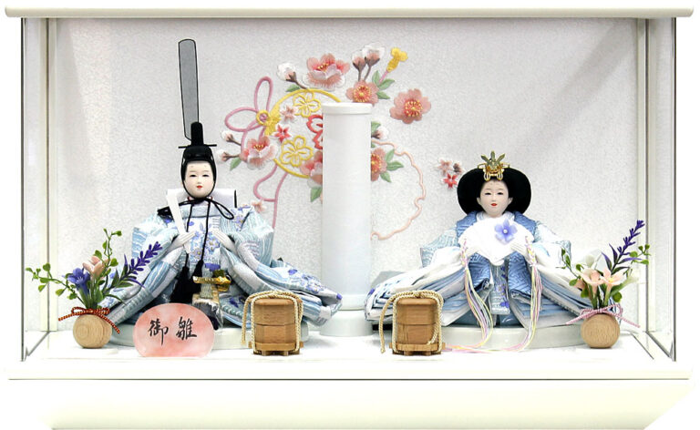 明るい色彩の花柄衣装をまとった親王と、フラワーオブジェが配された白色木目調ケースのお飾り。華やかさと上品さを感じさせるコンパクトな逸品です。
